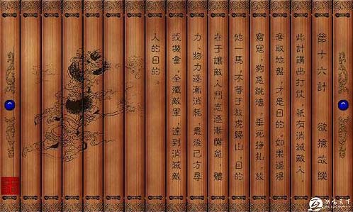 【原典】逼则反兵;走则减势①。紧随勿迫。累其气力,消其斗志,散而后擒,兵不血刃②。需,有孚,光③。【注释】①逼则反兵,走则减势:走,跑。逼迫敌入太紧,他可能因此拼死反扑,若让他逃跑则可减削他的气势。②兵不血刃:血刃,血染刀刃。此句意为兵器上不 沾血。②需,有孚,光:语出《易经.需卦》。需,卦名。本卦为异卦相叠(乾下坎上)。需的下卦为乾为天,上卦为坎为水,是降雨在即之象。也象征着一种危险存在着(因为“坎”有险义),必得去突破它,但突破危险又要善于等待。“需”,等待。《易经,需》卦卦辞:“需,有享,光享”。孚,诚心。光,通广。句意为:要善于等待,要有诚心(包含耐性),就会有大吉大利。【按语】所谓纵着,非放之也,随之,而稍松之耳。“穷寇勿追”,亦即此意,盖不追者,非不随也,不追之而已。武侯之七纵七擒,即纵而随之,故蹑展转推进,至于不毛之地。武侯之七纵,其意在拓地,在借孟获以服诸蛮,非兵法也。故论战,则擒者不可复纵。【故事】诸葛亮七擒孟获。