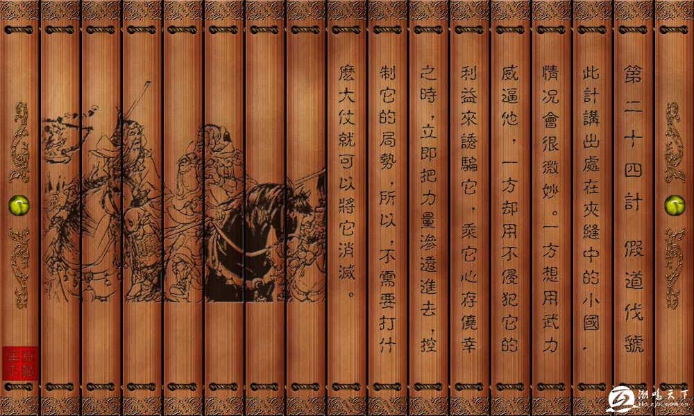 以借路为名,实际上要侵占该国(或该路)。虢,诸侯国名。也作“假道灭虢”。 【原典】两大之间,敌胁以从,我假以势①。困,有言不信②。【注释】①两大之间,敌胁以从,我假以势:假,借。句意为:处在我与敌两个大国之中的小国,敌方若胁迫小国屈从于他时,我则要借机去援救,造成一种有利的军事态势。②困,有言不信:语出《易经•困》卦。困,卦名。本纷为异卦相叠(坎下兑上),上卦为兑为泽,为阴;下卦为坎为水,为阳。卦象表明,本该容纳于泽中的水,现在离开泽而向下渗透,以致泽无水而受困,水离开泽流散无归也自困,故卦名为“困”。“困”,困乏。卦辞:“困,有言不信。”意为,处在困乏境地,难道不相信这基吗?此计运用此卦理,是说处在两个大国中的小国,面临着受人胁迫的境地时,我若说援救他,他在困顿中会不相信吗?【按语】假地用兵之举,非巧言可诳,必其势不受—方之胁从,则将受双方之夹击。如此境况之际,敌必迫之以威,我则诳之以不害,利其幸存之心,速得全势,彼将不能自阵,故不战而灭之矣。如:晋侯假道于虞以伐虢,晋灭虢,虢公丑奔京师,师还,袭虞灭之。【故事】蠢虞公贪财丧国。