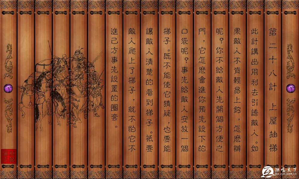 上楼以后拿掉梯子。借指与人密谈。也用以比喻怂恿人,使人上当。 【原典】假之以便,唆之使前,断其援应,陷之死地①。遇毒,位不当也②。【注释】①假之以便,唆之使前,断其援应,陷之死地:假,借。句意:借给敌人一些方便(即我故意暴露出一些破绽),以诱导敌人深入我方,乘机切断他的后援和前应,最终陷他于死地。②遇毒,位不当也:语出《易经.噬嗑》卦。噬嗑,卦名。本卦为异卦相叠(震下离上)。上卦为离为火,下卦为震为雷,是既打雷,又闪电,威严得很。又离为阴卦,震为阳卦,是阴阳相济,刚柔相交,以喻人要恩威并用,严明结合,故封名为“噬嗑”,意为咀嚼。本卦六三.《象》辞:“遇毒,位不当也。”本是说,抢腊肉中了毒(古人认为腊肉不新鲜,含有毒素,吃了可能中毒),因为六三阴兑爻于阳位,是位不当。此计运用此理,是说敌入受我之唆,犹如贪食抢吃,只怪自己见利而受骗,才陷于了死地。【按语】唆者,利使之也。利使之而不先为之便,或犹且不行。故抽梯之局,须先置梯,或示之梯。如:慕容垂、姚苌诸人怂秦苻坚侵晋,以乘机自起。【故事】刘琦登楼求妙计。