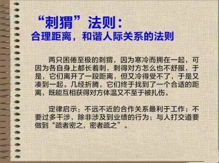 森林中有十几只刺猬冻得直发抖.为了取暖,它们只好紧紧地靠在一起,却因为忍受不了彼此的长刺,很快就各自跑开了.可是天气实在太冷了,他们又想要靠在一起取暖,然而靠在一起时的刺痛,又使它们不得不再度分开.就这样反反复复地分了又聚,聚了又分,不断在受冻与受刺两种痛苦之间挣扎,最后,刺猬们终于找出了一个适中的距离,可以相互取暖而又不至于会被彼此刺伤. 管理寓言29:"刺猬"法则简单地说,就是同事之间不可太过亲密,一天到晚在一起,也就是说,心灵是贴近的,但行动要注意保持距离.领导者要搞好工作,应该与下属保持亲密关系,这样做可以获得下属的尊重,同时还要注意与下属保持心理距离,避免在工作中丧失原则.能保持距离就会产生礼尊重对方,这种礼便是防止对方碰撞而产生伤害的海绵.