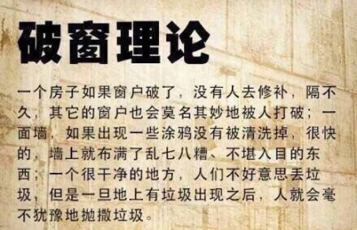 美国心理学家詹巴斗进行过一项有趣的试验:把两辆一模一样的汽车分别停放在两个不同的街区。其中一辆原封不动地停放在帕罗阿尔托的中产阶级社区;而另一辆则摘掉车牌、打开顶棚,停放在相对杂乱的布朗克斯街区。结果怎样呢?停在中产阶级社区的那一辆,过了一个星期还完好无损;而打开顶棚的那一辆,不到一天就被偷走了。后来,詹巴斗把完好无损的那辆汽车敲碎一块玻璃,结果仅仅几小时这辆车就不见了。