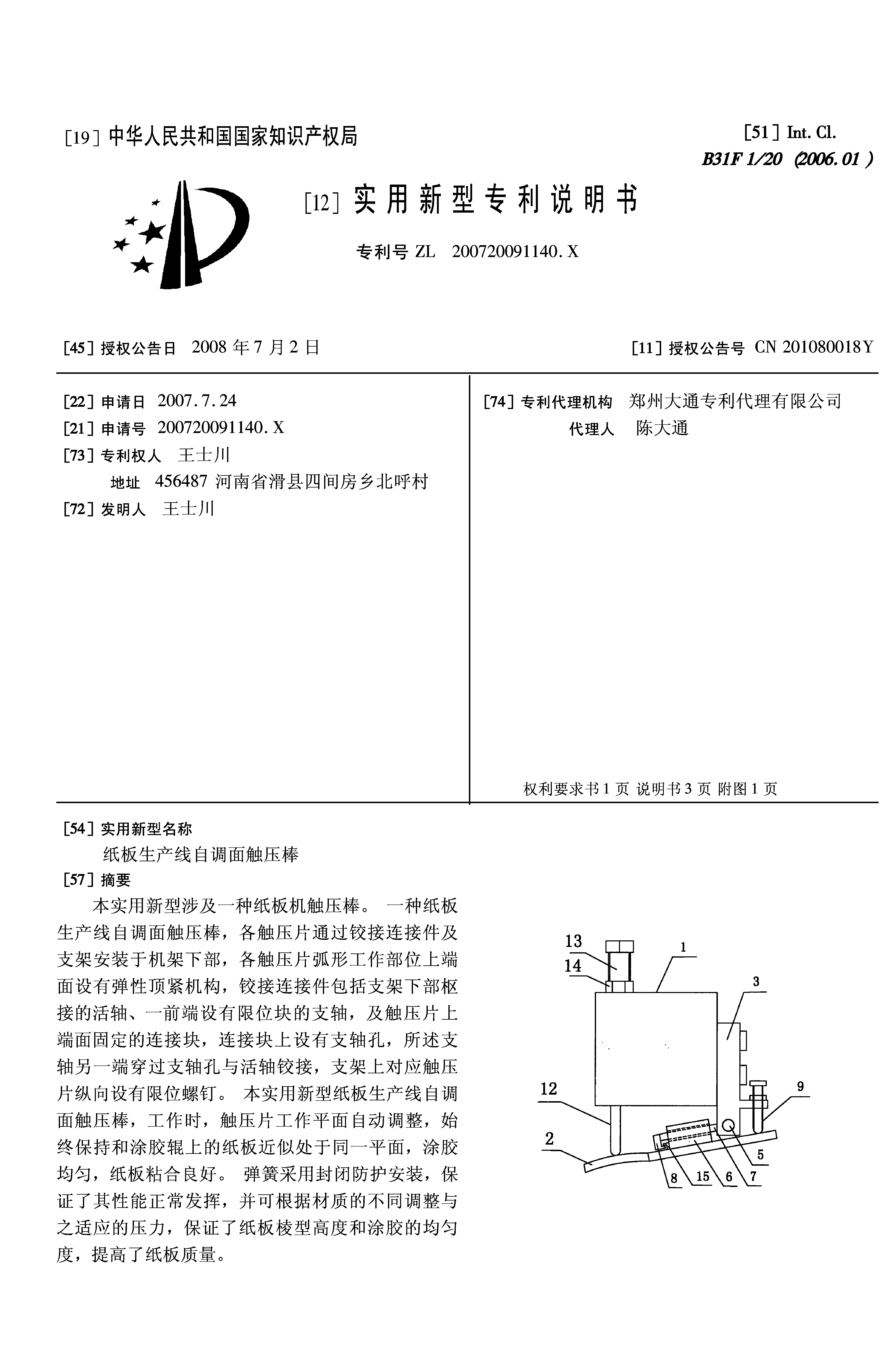 当前在纸板生产过程中,两层纸瓦楞进入烘干粘合段之前, 须二次涂胶,涂胶部由涂胶棍、计量棍和触压片组成,多块触压片平行于涂胶 棍纵向固定在机架上,触压片工作部位为弧型,工作时使多个瓦楞纸棱顶接触 涂胶棍,旧式纸板生产线触压棒结构设计上的先天性缺陷使其安装和使用存在 一些问题:1、在旧式纸板生产线中触压片是沿涂胶棍轴向方向通过支轴固定在 机架上,因加工误差、安装误差引起压板工作面不在一个平面上,使纸板局部 受压涂胶不匀,粘合不良。瓦楞纸板幅宽较小的时候,触压片小部分压纸,纸 板边部承受超压力引起塌楞。2、在旧式机中,压力弹簧长时间外漏使用,弹簧 上布满粘合剂和尘垢,时间长了弹簧容易失去弹性,同时弹簧压力不可调,而 在实际生产中材质的变量很大,厚纸需要的压力大,薄纸需要的压力小,薄厚 纸变换的时候,明显暴露出压力过剩及压力不足的缺点:压力过剩,棱型压塌, 强度降低,压力不足涂胶不匀,粘合不好。